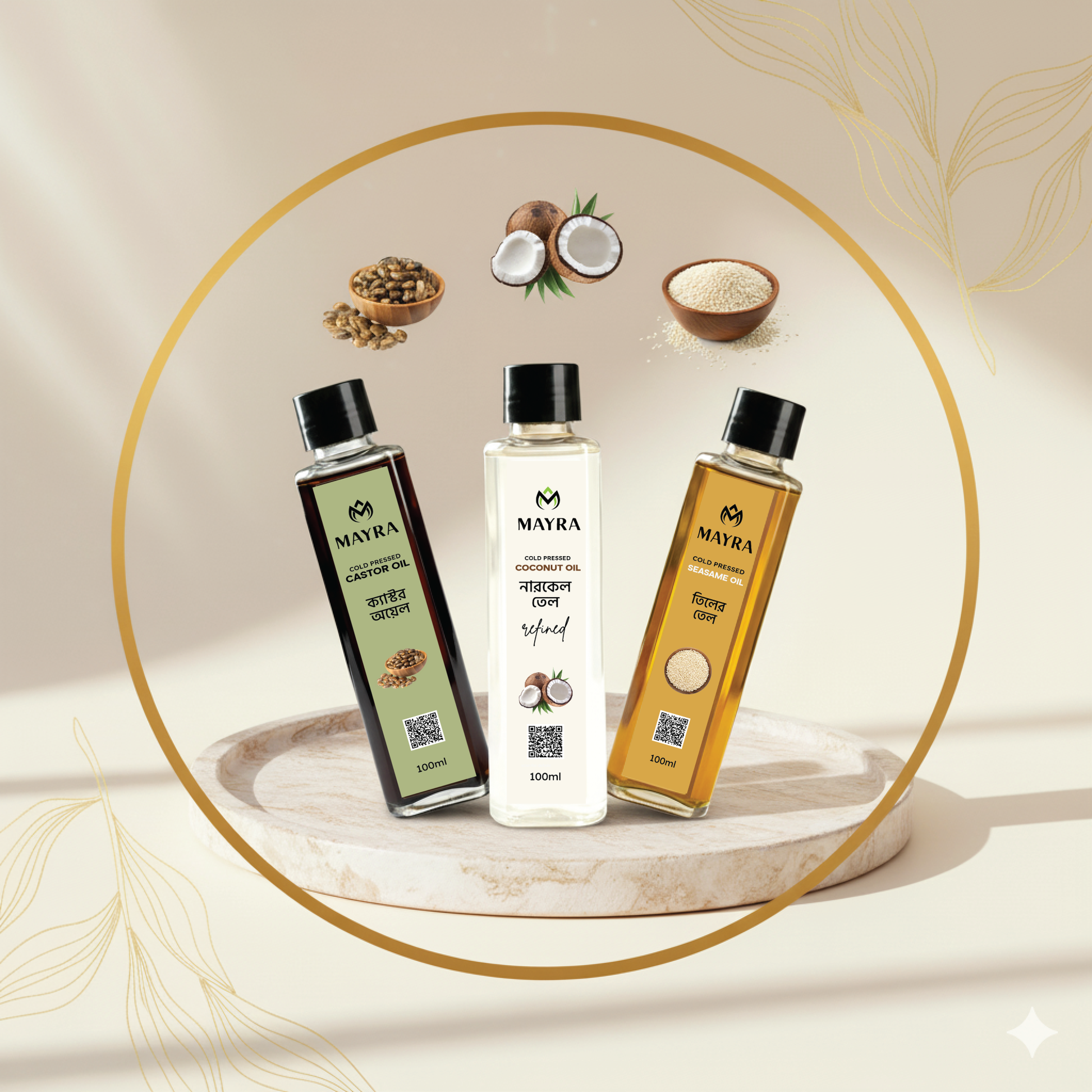 Mayra Triple Care Oil Combo brings you the perfect blend of Coconut Oil (নারকেলের তেল), Castor Oil (ভেন্নার তেল) এবং Sesame Oil (তিলের তেল) – তিনটি premium cold pressed oil একসাথে in one value pack. Each bottle 100ml, total 3 bottles = 300ml.