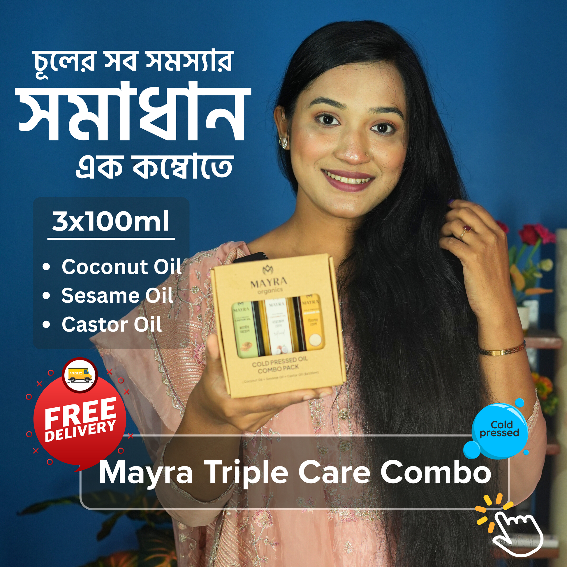 Mayra Triple Care Oil Combo তিনটি Premium Cold Pressed Oil একসাথে in one value pack. Each bottle 100ml, total 3 bottles = 300ml.